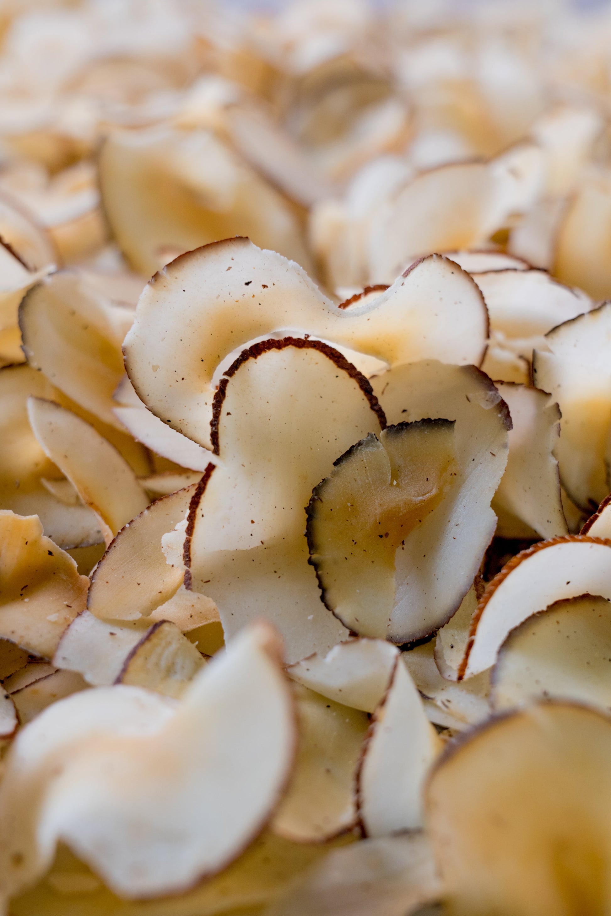 Chipsy kokosowe powstają z miąższu dojrzałego kokosa. Kroimy kokos na cienkie plasterki i pieczemy je w piecu bez dodatku oleju.