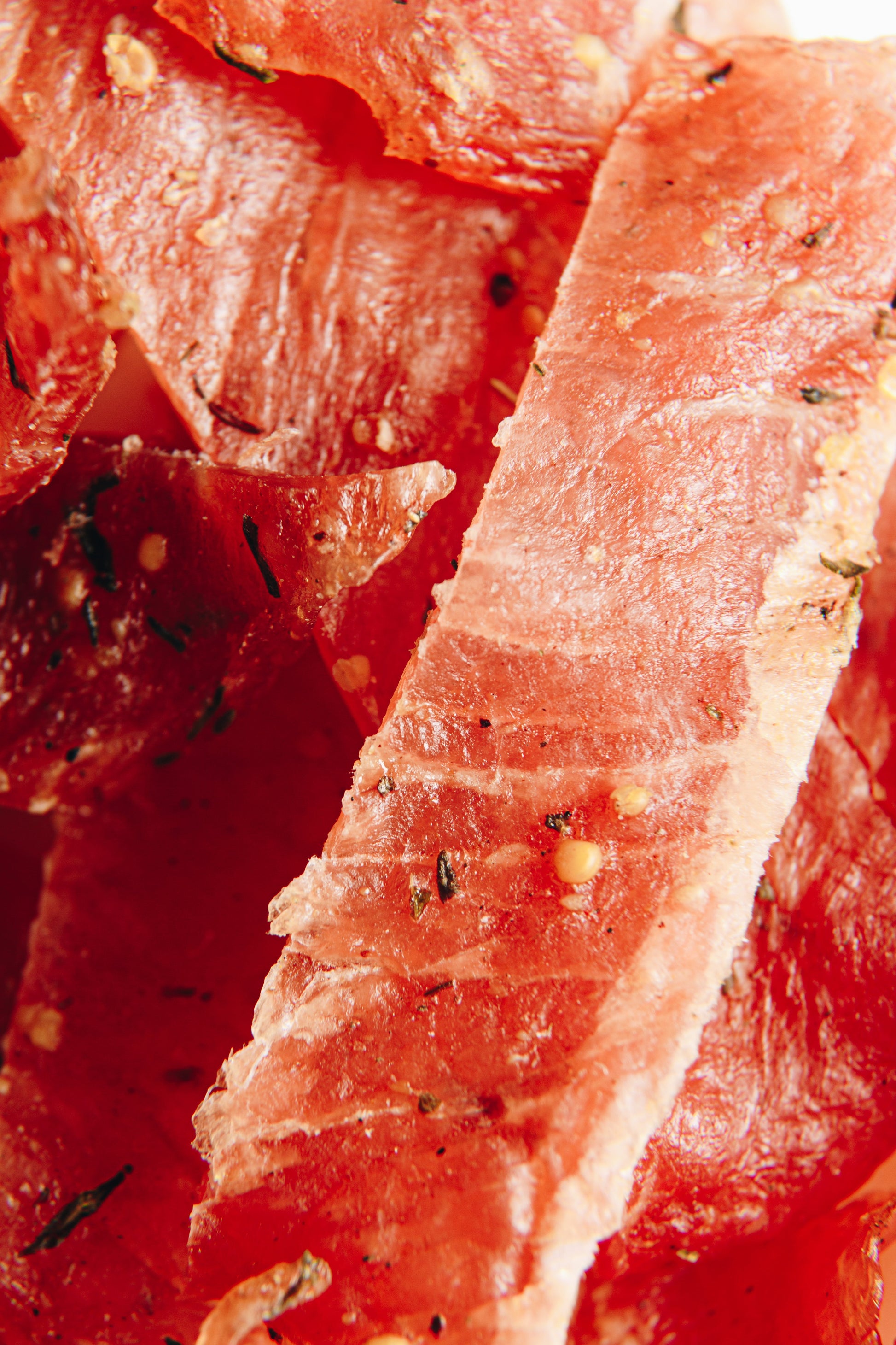 Jerky to suszone mięso przygotowane poprzez odwodnienie i dodanie przypraw. Powstaje z cienkich pasków mięśni, które są marynowane i suszone do stabilnego stanu o niskiej wilgotności. Nasze jerky produkujemy wyłącznie z polskiego mięsa.