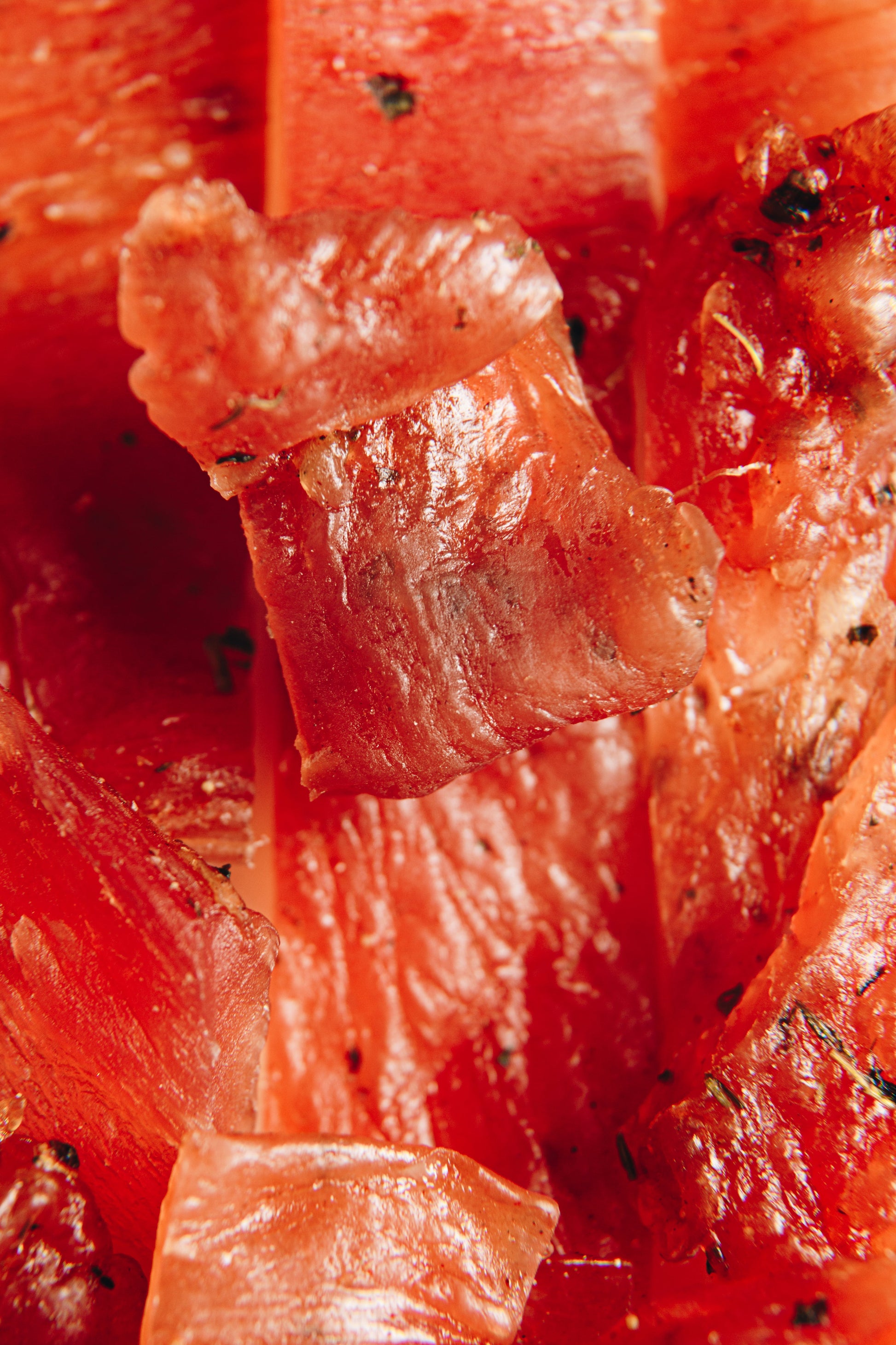 Jerky to suszone mięso przygotowane poprzez odwodnienie i dodanie przypraw. Powstaje z cienkich pasków mięśni, które są marynowane i suszone do stabilnego stanu o niskiej wilgotności. Nasze jerky produkujemy wyłącznie z polskiego mięsa.